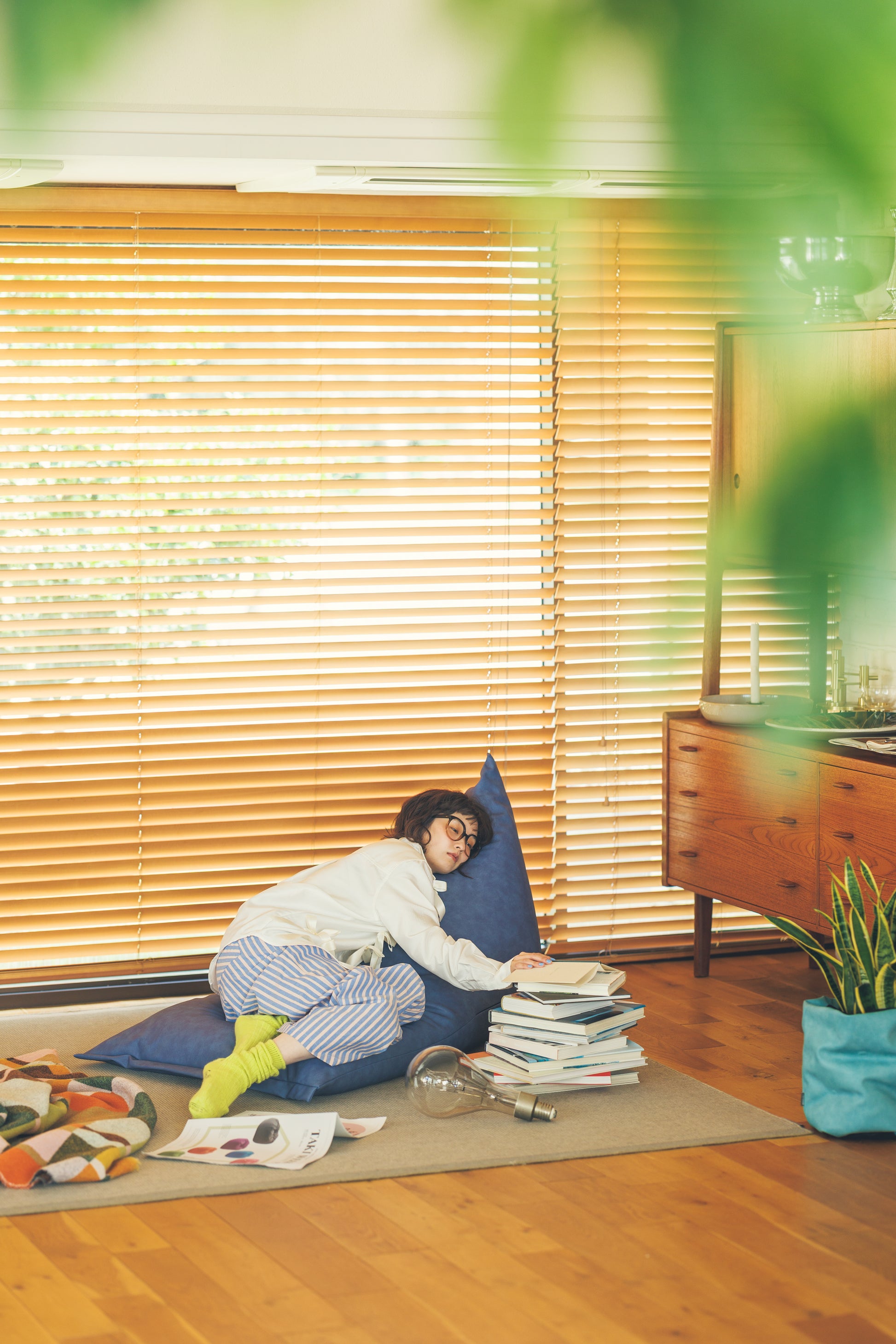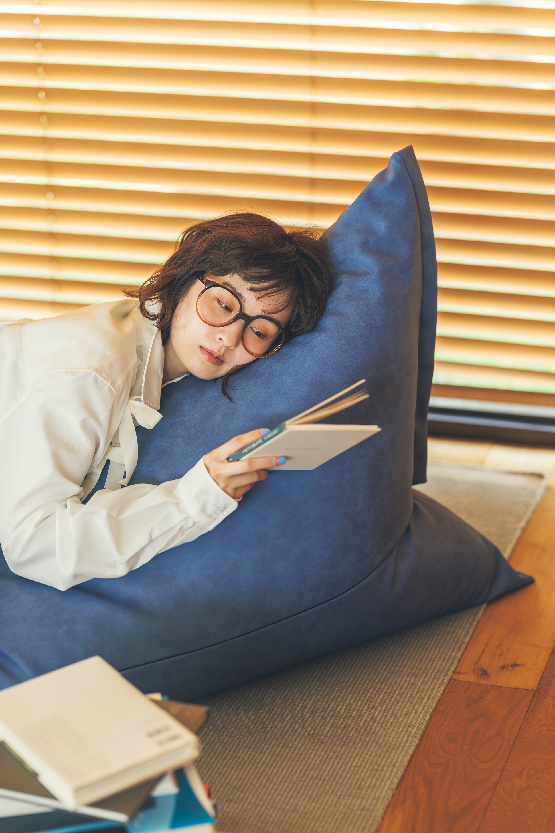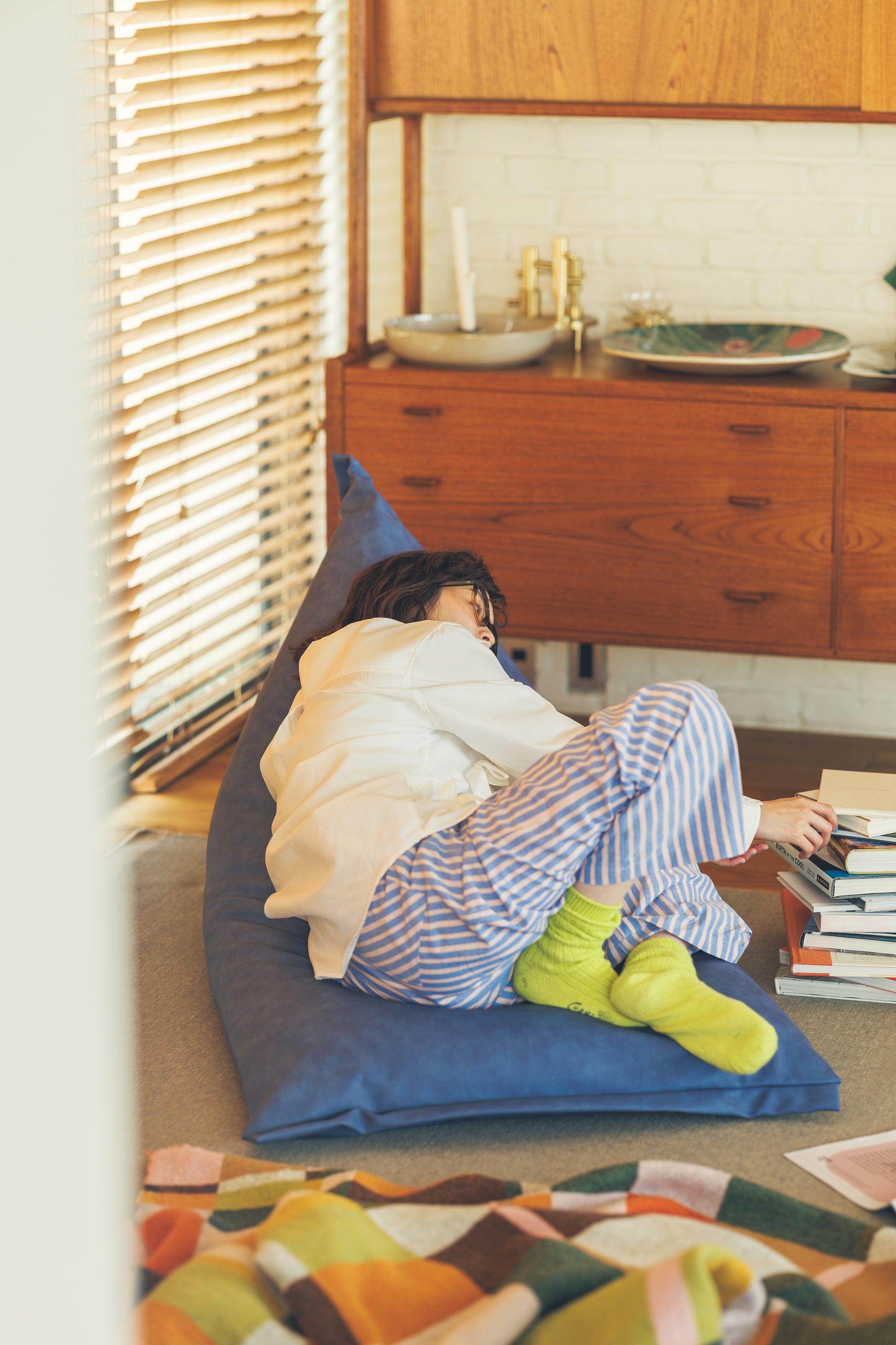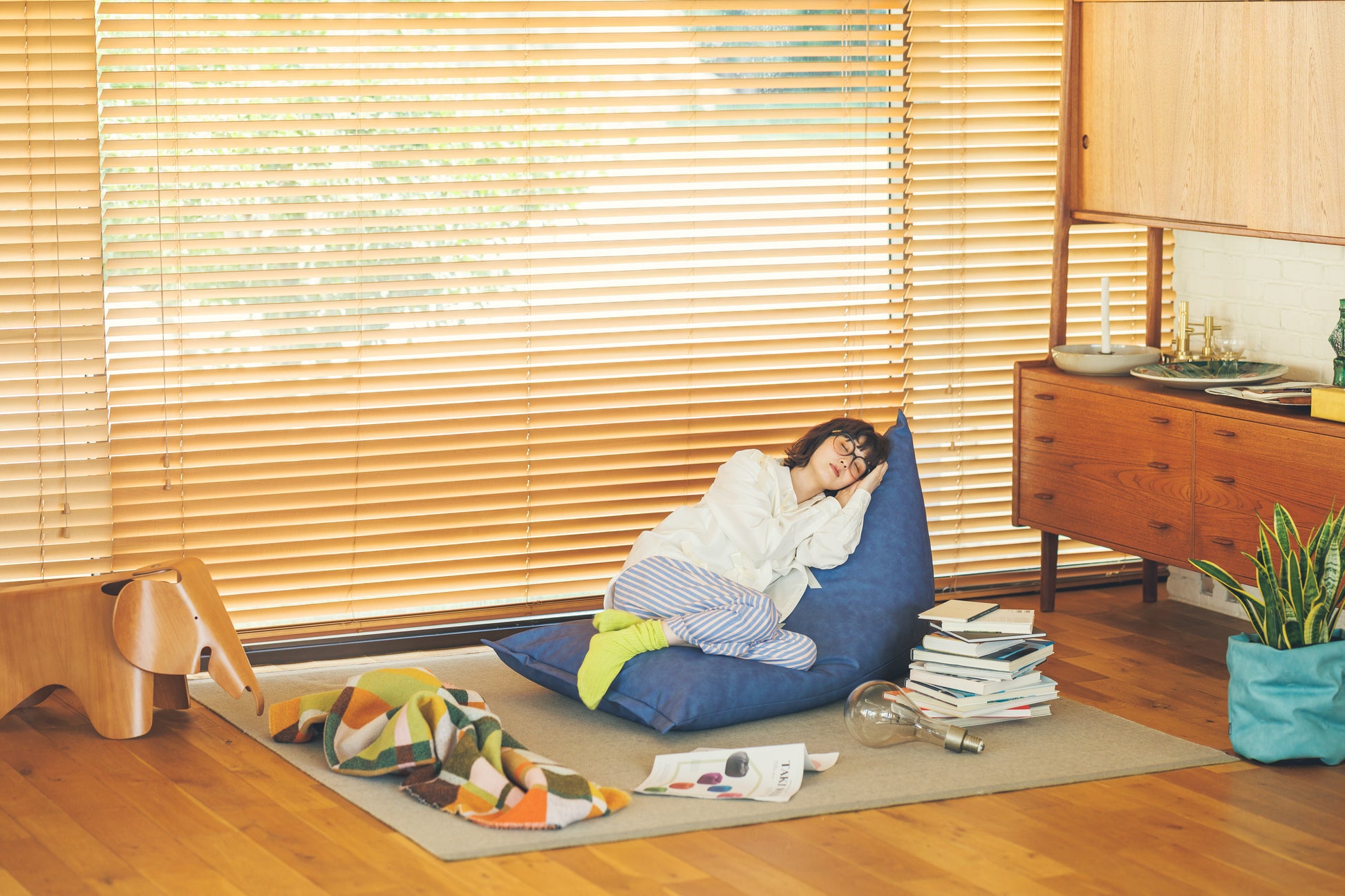 あえて“3割の隙間”を設けた三角型ポトラプラスは、真中に座ると座椅子、前の方に座ると寝椅子のように、ビーズがスッと移動して体にフィット。包み込まれるような座り心地を生み出します。